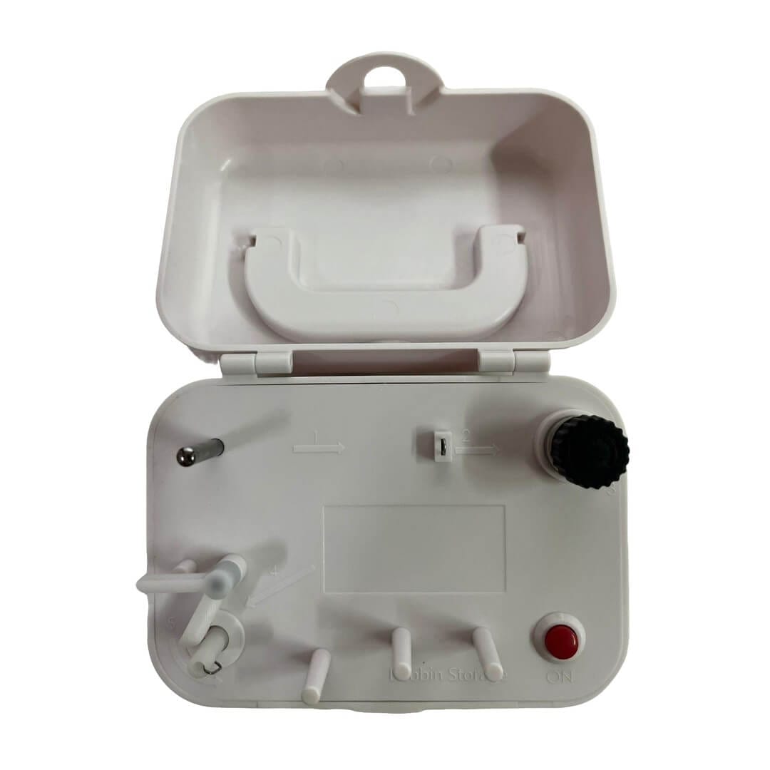 O aparelho é integrado em um estojo robusto na cor branca, que além de proteger o mecanismo, serve como base de apoio e oferece espaço para armazenamento de pequenas ferramentas ou bobinas adicionais. Possui um botão “ON” para fácil operação e um design intuitivo com pinos e guias para o posicionamento do fio. Acompanha cabo USB (sem adaptador de tomada). Perfeito para manter seu espaço de trabalho organizado e suas bobinas sempre prontas para uso.