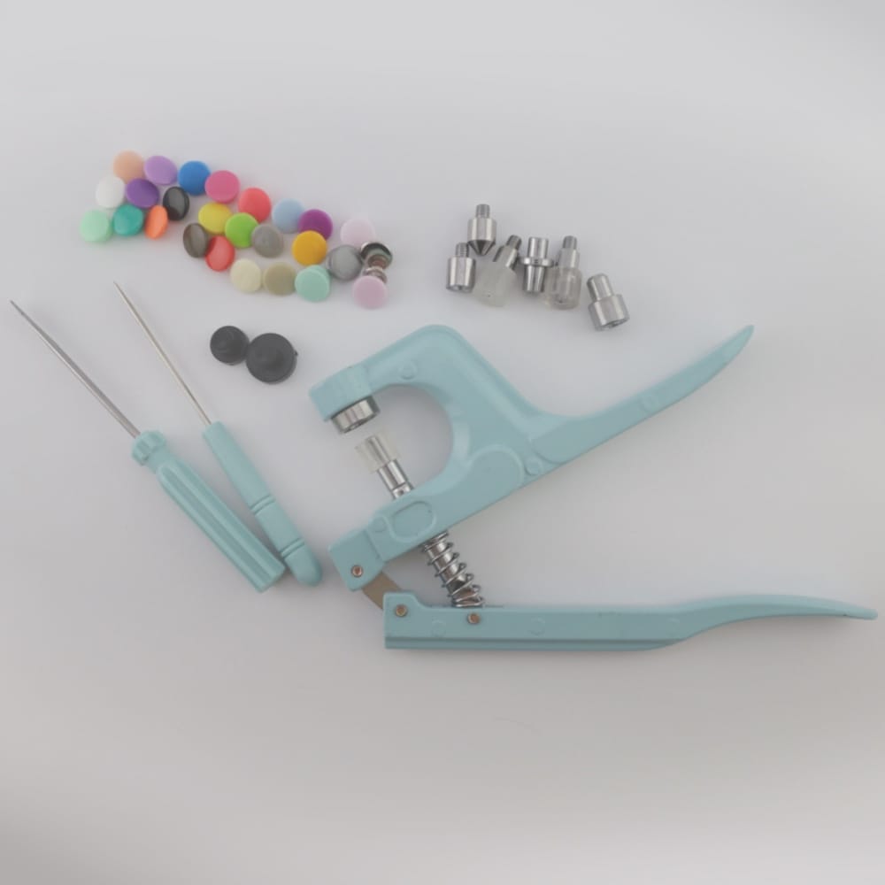 É um kit completo, composto por alicate, furador, botões de plástico, botões de metal e ilhós.